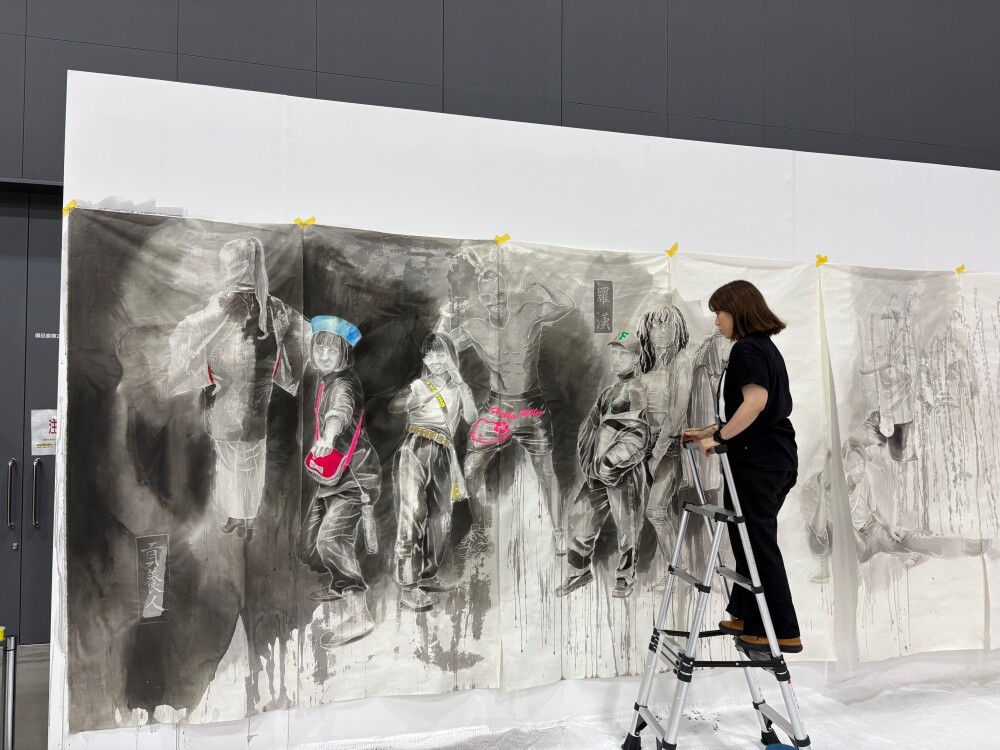 本ブースでは、ライブドローイングが行われていた。作家が脚立に登り、制作する様子を見学できた。画面の多くは水墨で描かれているが、赤や青の差し色が目を惹いた。
