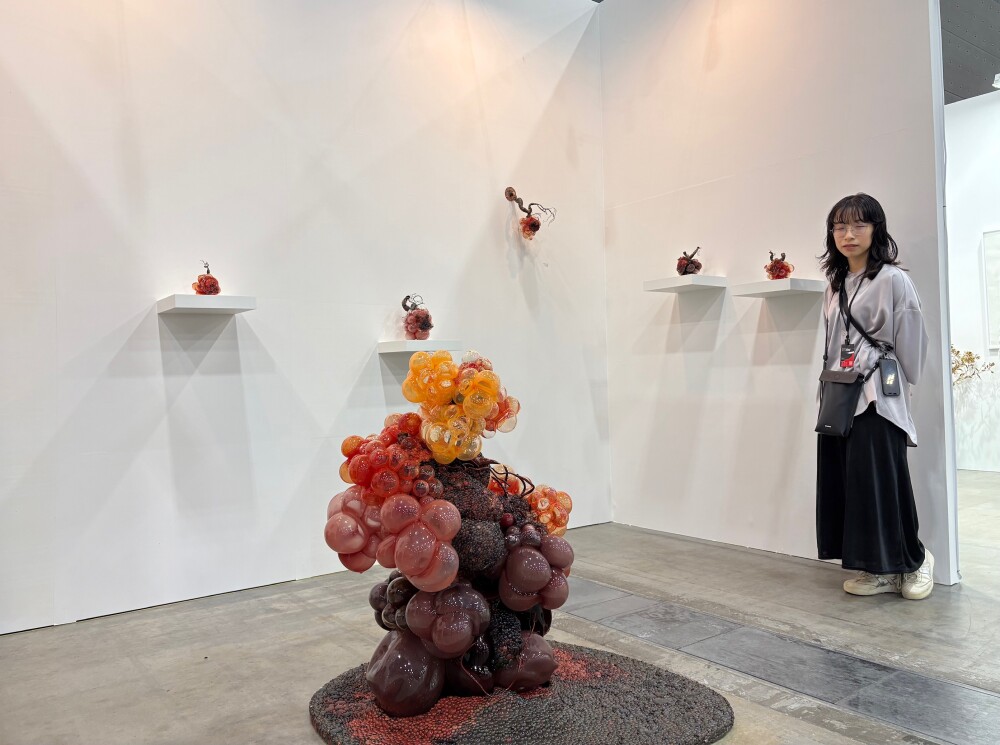 赤色で球状のオブジェが、モコモコとたくさん連なっている。綺麗というより、近寄りにくい雰囲気のある作品だ。彼女の話では、死や腐敗から生のあり方を探ることに興味があるそうだ。近寄りがたく感じるのも無理はない。