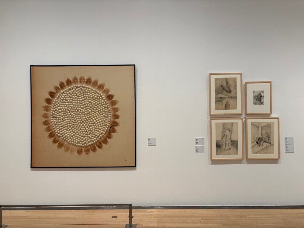 半球状の突起が円形に並び、周囲を花弁の模様が取り巻いている。突起の部分は半分に割れたピンポン玉で、花弁はアイロンの焦げ跡のようだ。彼女は、前衛美術集団〈九州派〉の主要なメンバーのひとりであり、フェミニズム的な問題意識を表現してきた。大量のアイロンの焦げ跡は、日々繰り返される女性の家事を暗示しているかのようだ。