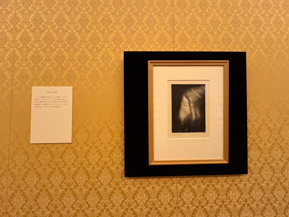 オディロン・ルドンの初めての石版画集『夢の中で』から最後の『ヨハネ黙示録』まで、彼の代名詞ともいえるモノトーンの幻想的な世界が広がる。とはいえ、近くで見ると不気味な作品が多い。アニメ映画に登場する魔物のように描かれていない分、その不気味さには深みと強さがある。とてもインパクトのある展示になっている。
