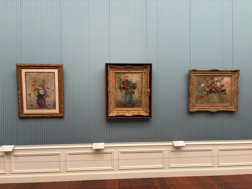 花瓶に生けられた色とりどりの花々の作品が観客を出迎える。作品のサイズも大きすぎることなく、大作を前にしたときの圧迫感がない。水色系の壁面の色合いと調和し、とても落ち着いた印象を受ける。中には、個人蔵となっている作品もあると聞く。その人物は、この絵の隣に、どのような作品を飾るのか、少し気になった。