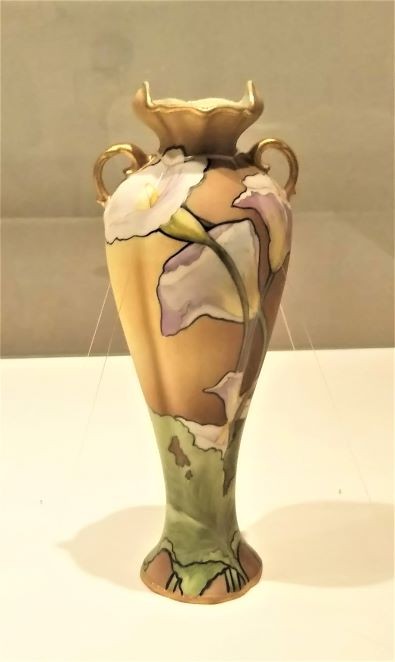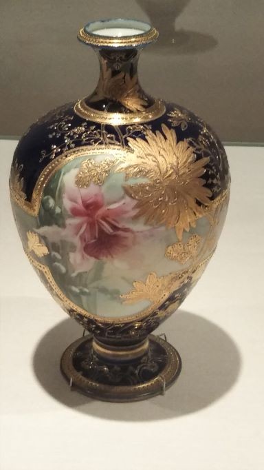 美術館の説明にもあるように「オールドノリタケとは、株式会社ノリタケカンパニーリミテドのルーツ、森村組および日本陶器によって、明治中期から第二次世界大戦期にかけて製作・販売・輸出された陶磁器を指します。」明治前期、明治政府の殖産興業の下で輸出用の陶磁器の生産が強化されるなかで、オールドノリタケの製造が始まりました。オールドノリタケは政府の援助を受けることなく独自で海外に販売拠点(モリムラブラザーズ)を築いた民間企業(森村組)によって作られた点が他の輸出陶磁と大きく異なります。アメリカを中心とする海外に輸出された陶磁器ですが、ここ数十年前までは長らくその存在が忘れられていたそうです。家庭にあった品々がオークションなどで市場に出始めると人々の眼に留まるようになり、再び注目を集めて人気を博すようになりました。