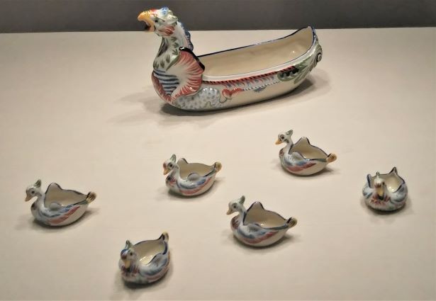 東京・日本橋で絵草紙屋を経営してた大倉は、森村組の事業に参画して、絵草紙屋で培った審美眼とデザイン感覚を生かして、森村組でアートデレクターの役割を果たすようになり、陶磁のデザインに一大転機をもたらしました。きっかけとなったのは1893(明治26)年のシカゴ万博です。大倉は西欧の陶磁器を目にして日本陶磁との差を感じ、西洋陶磁の道具類や陶磁器を持ち帰えり、専属絵付職人に和風から西洋風のデザインへの転換を要請しました。洋風の絵柄、装飾文様、構図、色彩など西洋風デザインへ他社に先駆けて舵を切りました。一方日本的なモチーフもすべて捨て去った訳でなく、19世紀後半から流行した「日本趣味」に沿った和のモチーフを西洋風にアレンジしたり、エジプトやインドなど「異国趣味」のモチーフのものもあり、輸出用に様々なニーズに合わせて多様多彩なモチーフで制作されたのでした。