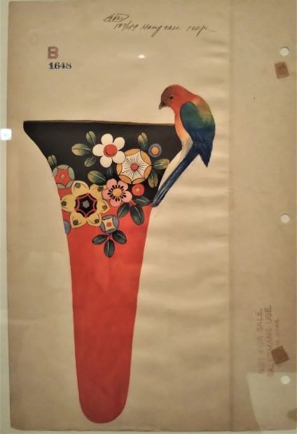 1900(明治33)年のパリ万博ではアールヌーヴォーが大流行し、ジャポニズムの流行は過去のものとなっていました。洋風のデザインにいち早く舵を切っていた森村組は時代の波に乗り遅れることはなかったのです。陶磁器の世界でも、常に流行を感じ取り次々と新しいデザインを生み出していかなければなりません。そこに大きく貢献したのがニューヨークに拠点を置くモリムラブラザーズの図案部でした。図案部にはアメリカ在住の日本人画家や日本から渡米した絵師が現地で生活を体験しながら、女性のファッションなどから流行を感じ取り、新しいデザインを考案したと説明されていました。最先端の欧米のスタイルに日本流の解釈を加えて独自の表現を生み出していきました。ここでは特徴的な4つのスタイル「ジャスパーウェア風」「クロワゾニスム風」「アールヌーヴォー風」「アールデコ風」が紹介されていました。「アールヌーヴォー風」は有機的な曲線が優美で目を惹き、うっとりと眺めてしまいます。単純化された文様と明快な色彩が特徴的な「アールデコ風」は、「ノリタケ・アールデコ」と呼ばれ、ポップで愛らしく人気を博したそうです。海外から送られてきたデザイン画と一緒にそこから形になった陶磁器も展示され、日本の職人の技と心意気も伝わってきます。
