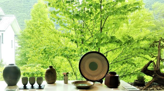 美術館のキャッチコピーそのままの「土と語る 森の中の美術館」で、周囲が緑に囲まれ、新緑の季節と秋の紅葉の季節は殊に美しく、心癒されます。車で訪れる人が殆どで、公共交通機関で訪れるとなると、美術館HPアクセス案内で電車とバスの接続を要チェック!意外にも宝塚からならそれほど時間はかからない。陶芸教室や時折のコンサートの開催や、窯元巡りの露地歩き(コロナ禍で中止)などイベントも多彩です。レストラン横のウッドデッキから眺めれば、対岸の山の麓に丹波焼窯元の家々広がります。