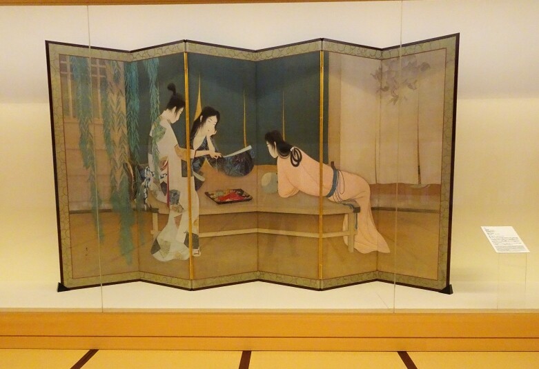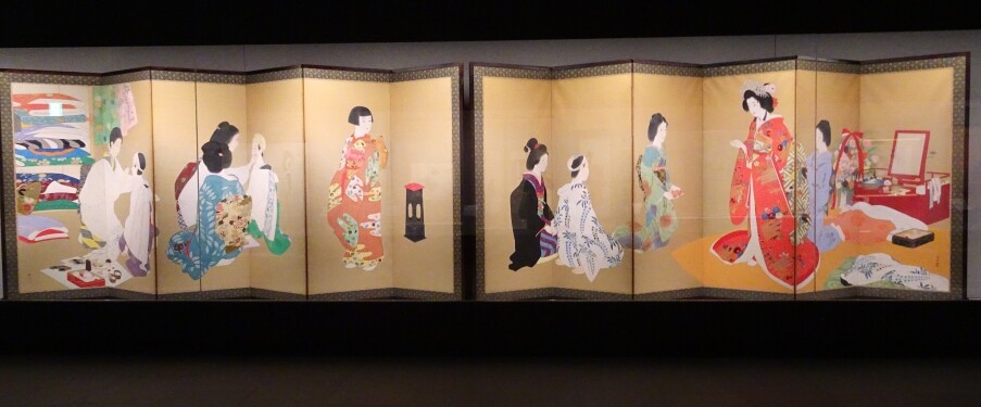 清方門下の門井掬水の六曲一双の大きな屏風、舞台が始まる前の舞台裏を描いています。着物の模様など凹凸も描かれていることにもご注目ください。