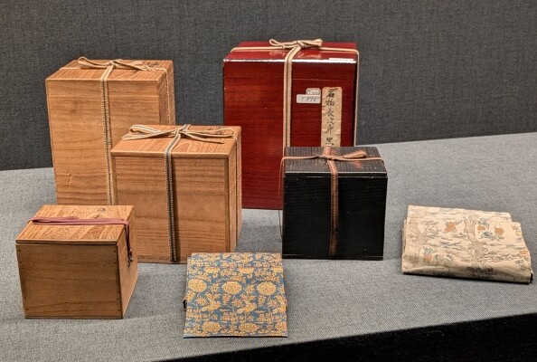 お道具を収納する箱は、茶道具だけに限りませんが、それでも所有者が移るごとに、それまで収納されていたお箱も大切にとの思いもあり、これまでの所有者への敬意も込めて、これまでの伝来を丸ごと納めるお箱を誂える。箱書き、つまり箱の表裏の箱書きも語りますが、箱そのものが誰の所持であったかを物語っているのです。マトリョーシカ状態の幾重にも重なるお箱です。