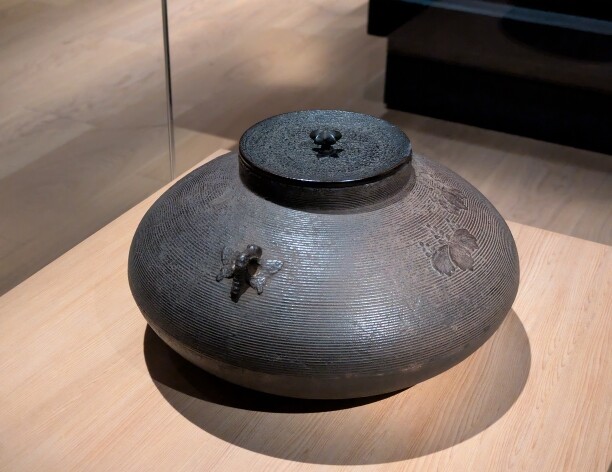 藤田美の仕切りの壁面に展示されている《色絵古銅三ツ人形蓋置》唐子の蓋置です。私には「か~ごめ、かごめ♪」にしか見えなかった!“カゴメカゴメ”の歌には実はちょっと怖さが潜むと聞いたことがあり、唐子の表情にそれを見た思いがしました。