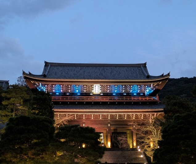 夜間特別拝観の知恩院前を通過。円山公園を通って