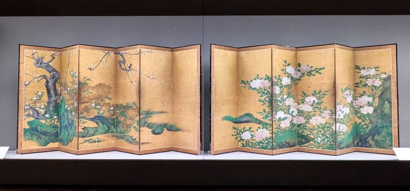 重要文化財《花卉図屏風》海北友松筆 6曲1双 紙本金地著色 桃山時代(17世紀)京都・妙心寺 通期 第1会場