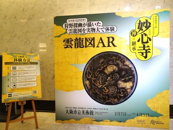 1階中央ホールにある【雲竜図AR】体験パネルにあるQRを読み込んで、パネルの雲竜図(妙心寺法堂にある狩野探幽筆の雲竜図)にスマホを向ければ、龍が現れて美術館の天井へ昇っていきます。是非体験してみてくださいね。