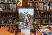ざっくり木炭で下描きをし、油彩で線を起こして、足を開いたり閉じたり、背景を変えたり、飛ばしてみたり、形を変えて、ざっと油彩で色を入れたところ。「土器土偶怪人模型箱絵…