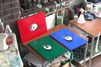 「絵の具の絵」紙にアクリル絵具、鉛筆韓国のアートフェアに出品するために、ニスを塗っているところ。日本画の絵具皿にアクリル絵具を置いて、その絵の具で周りを塗る。写真的…