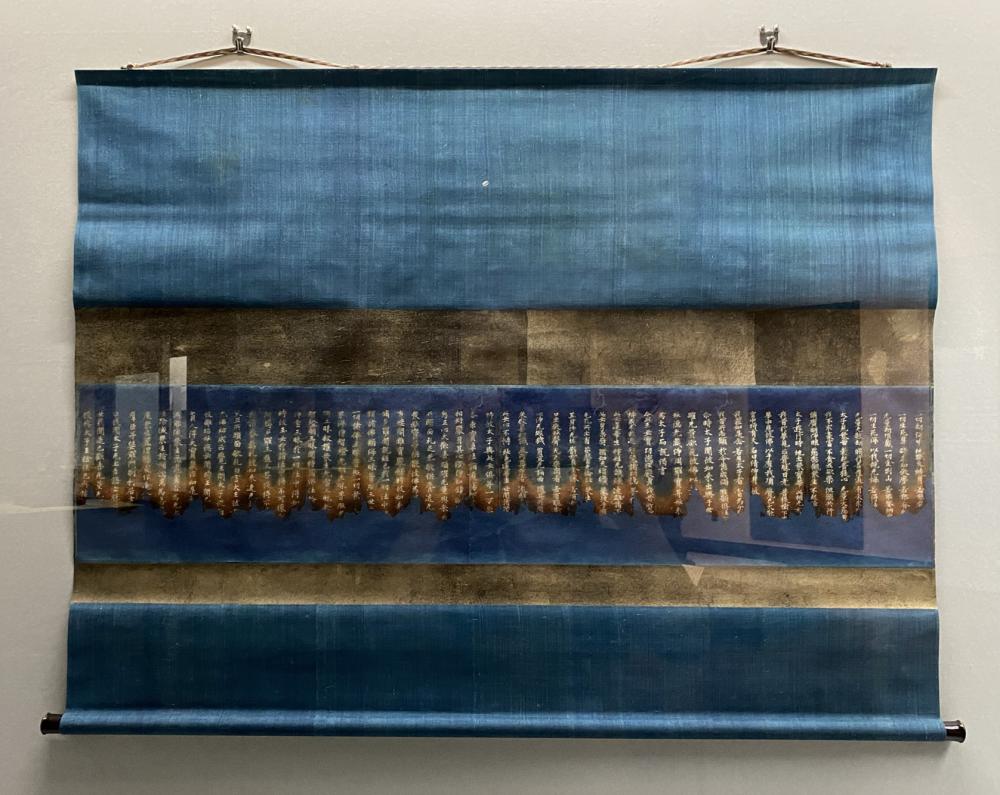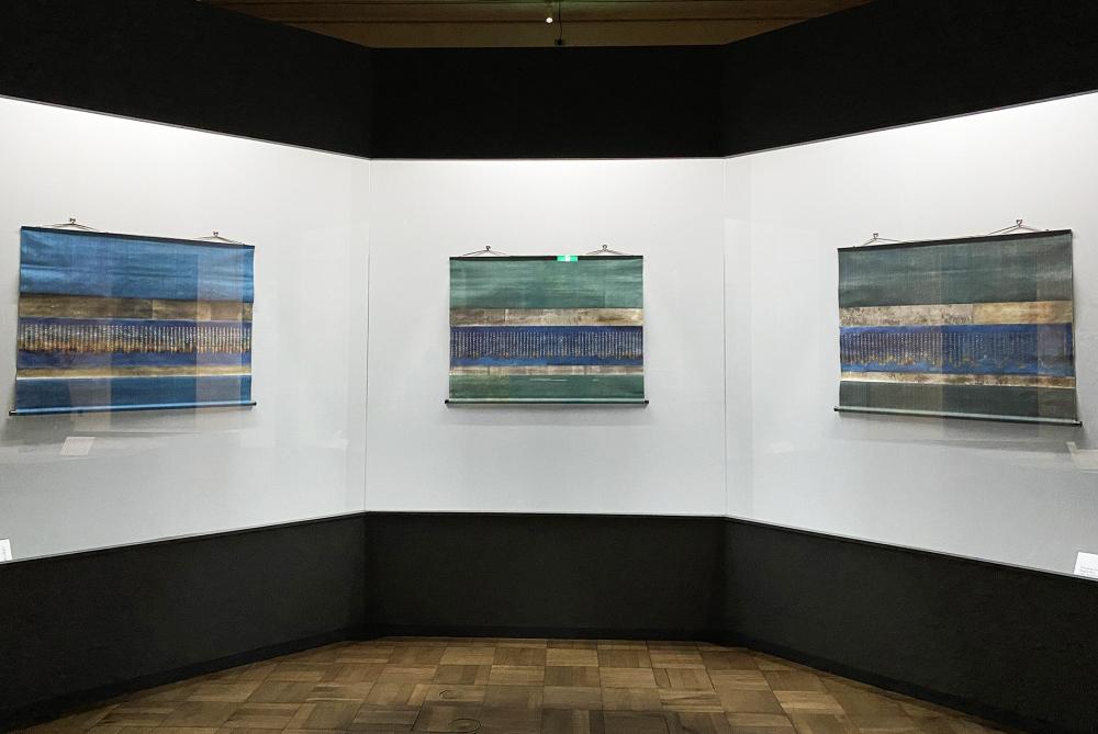 展示の三幅は、それぞれ鮮やかなブルー、グリーン、深緑に、金色の料紙を帯状に重ねた上に、焼経が貼り重ねられる形で仕立てられています。まるで今日に、表具に生まれ変わるために、焼け跡から発見されて、八世紀から現代まで存続してきたかのような、完璧な姿でした。