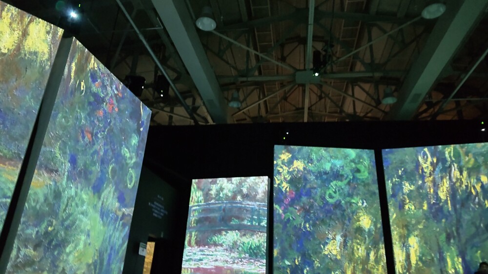 まず、大きなスクリーンで印象派の絵画が映し出されること。風景画だと、実際の風景を眺める感覚で鑑賞できる。それから、視点。床に椅子やクッションが置いてあって、それに座って見上げるような視点で鑑賞するため、特に風景画の迫力を感じた。あと、やはり印象派の作品は色彩が映える。拡大されると筆致をよく見ることができて、興味深かった。また、複数の作品が抱き合わせで流されたので、鮮やかで美しかった。
