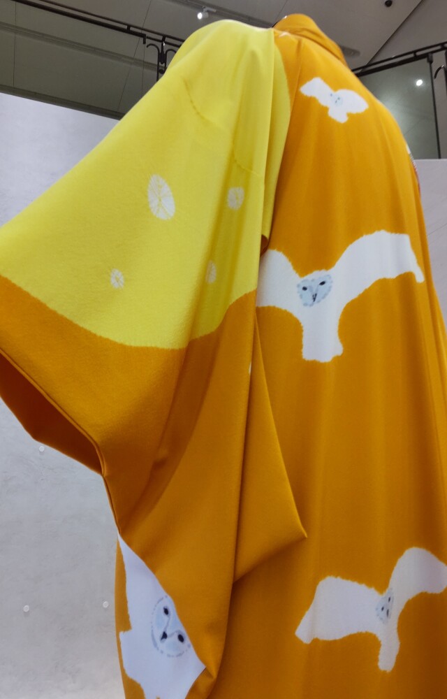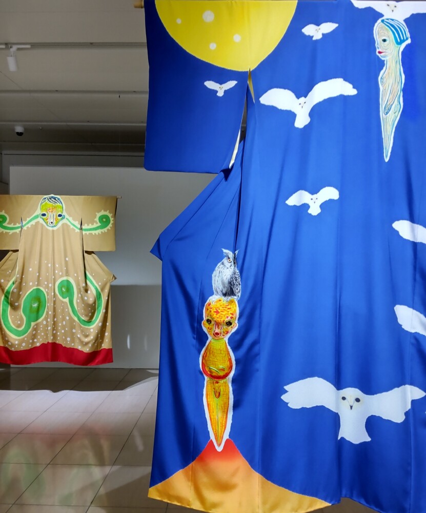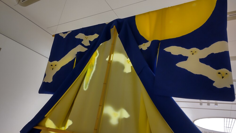 衣桁に掛けられた着物は、正面から背中の模様が透けて見えた。それによって、ミミズクがたくさん飛んでいるように見えたり、ゼンマイの方は絞りの模様が蛍みたいに見えたりして、ハッとする美しさだった。衣服・着物は人間が着て完成するはずであるが、これは人が着ていたら見られなかった光景だった。