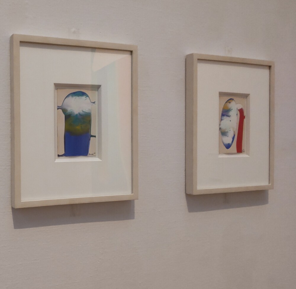 元永定正「無題」。ポストカードサイズの作品でサッと見れるのだが、立ち止まると絵の具の混ざり具合とか広がり具合とかどうやったんだろうと思う。筆を使ったのか、絵の具を落として広がるのに任せたのか、絵の具を塗った上から紙などでおしつけたのか。そうやってじっと眺めてると、絵から風景が見えてくるから不思議だ。