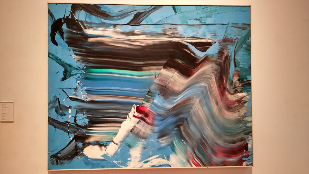 そして、楽しみにしていた白髪一雄。「東方浄瑠璃世界」、最初見た時はスピード感があって面白いなくらいの感想だった。全体的に見ると速すぎてブレた被写体のような絵面と、美しい青色が目に入る(調べたら、浄瑠璃は芸能じゃなくて、浄瑠璃世界という仏教用語だった。また、ラピスラズリの色のこともそう呼ぶらしい)。
