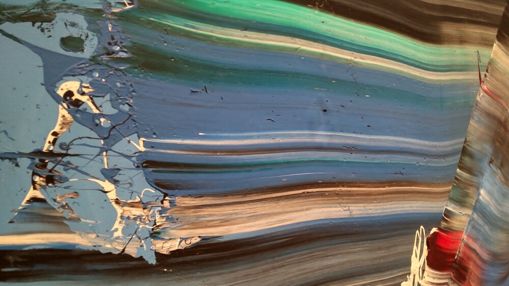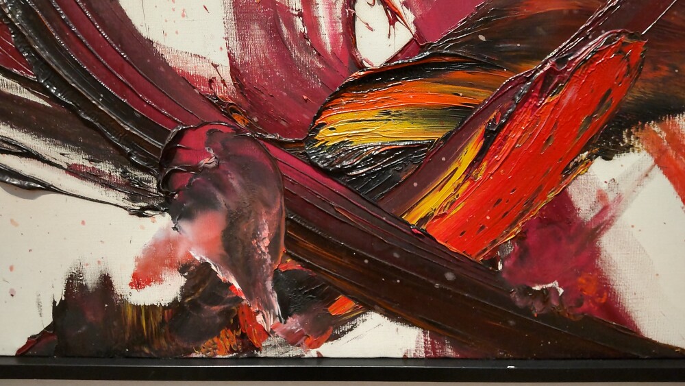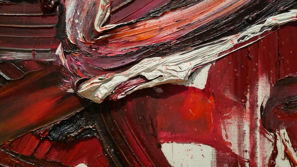 部分を見ると、絵画の表面に孔が空いていて厚塗りの感じが伝わってくる。また、画面の右側はおしやられた絵の具が溜まって盛り上がっていた。