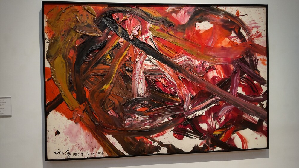 白髪一雄「天空星急先鋒」、全体を見ると左上から右下へ走る線が勢いを感じさせて、さすが足で描いてるだけあるなと思う。