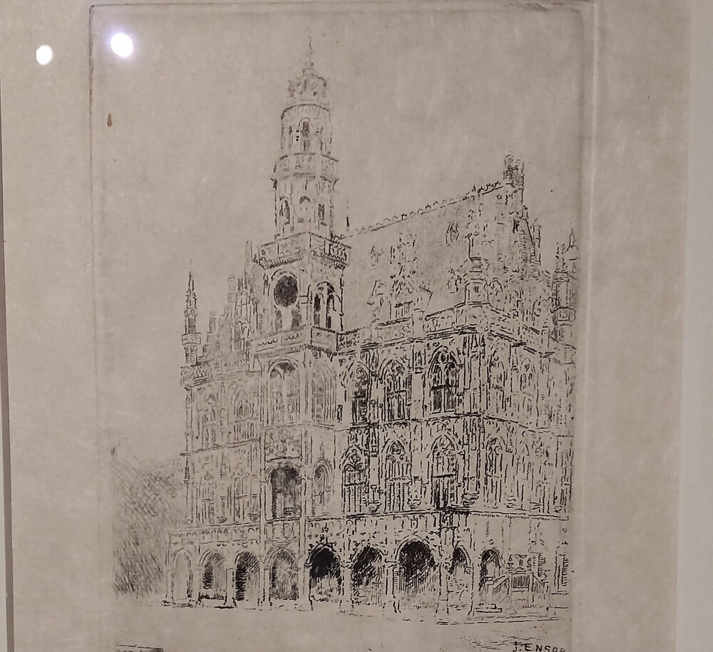 アンソール,ジェームズ「アウデネルデの市庁舎」。細かな線から版を引っ掻いていく手が想像された。