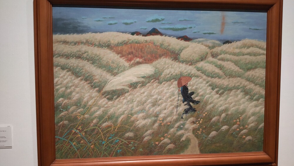 ススキを渡る風が見えて、その風を目で追っていくうちにススキが動いているように見える。手前のススキは一本一本の絵の具の跡が見えるが、後景のススキは絵の具の跡が見えずひとかたまりになっている。それでも風になびくススキの姿が感じられる。すごい。