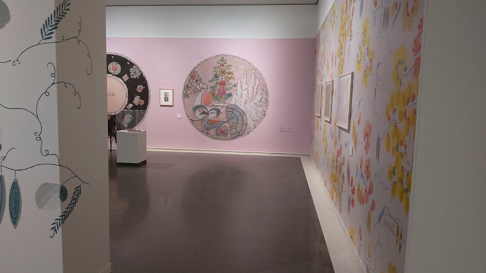 ピンクの壁に描かれているのは上野リチ・リックスによる七宝飾りプレート「二羽の孔雀」のデザイン。さっき見た刺繍屏風とリンクしている。沢山の模様のデザインを見ると、企画展で見た千代紙の模様を思い出す。鮮やかな花柄や鳥の卵のデザインは新年度にふさわしい展示だった。