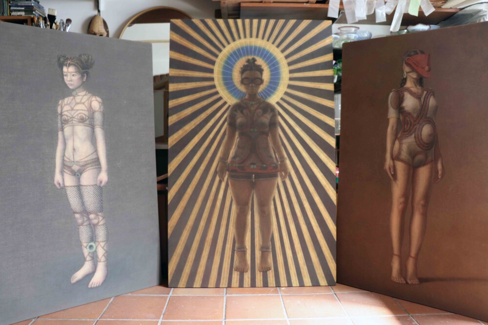 色を何度も変える。背景の位置も変える。文様も描きおこしながら、変える。油彩画制作中「土器土偶怪人模型箱絵原画(または土器土偶怪人カード)」(仮)2月の個展で展示予定。2026年2月9日(月)ー14日(土)ギャラリーSIACCA東京都中央区銀座2-9-16 サウ…
