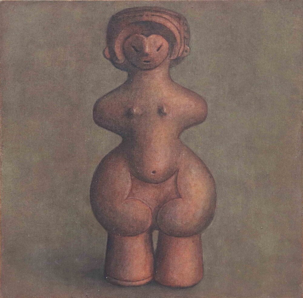 土偶模造を野焼きした彫刻、その模造土偶を写真のように描いた絵画、土偶の元になった人物を復元した絵画を展示しています。