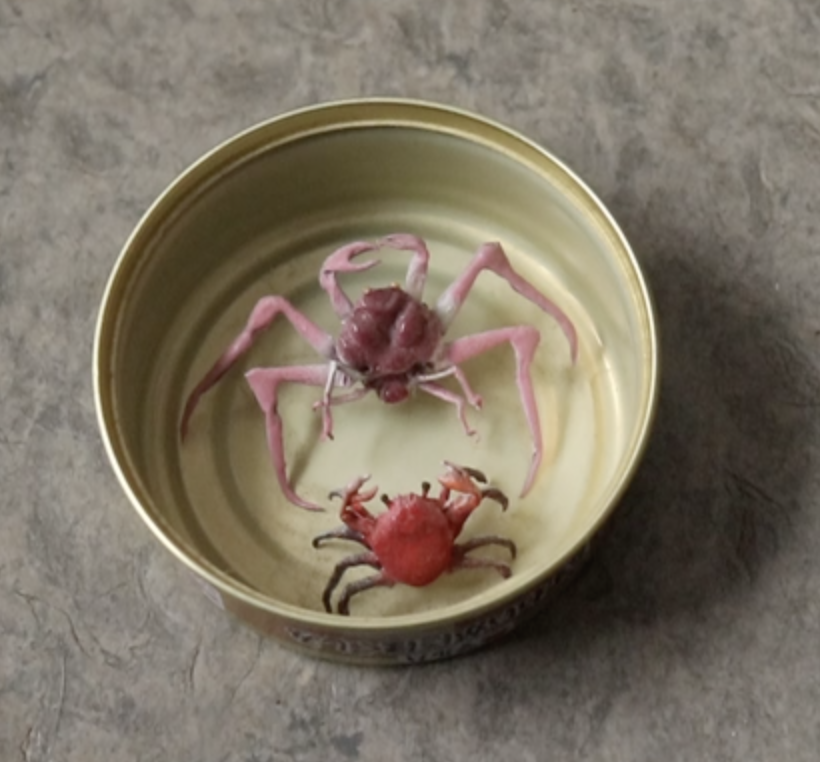 どれにしようかとぐるぐる回っていると、あとからテーブルにあるカニ缶にも作品があると画廊主がいう。