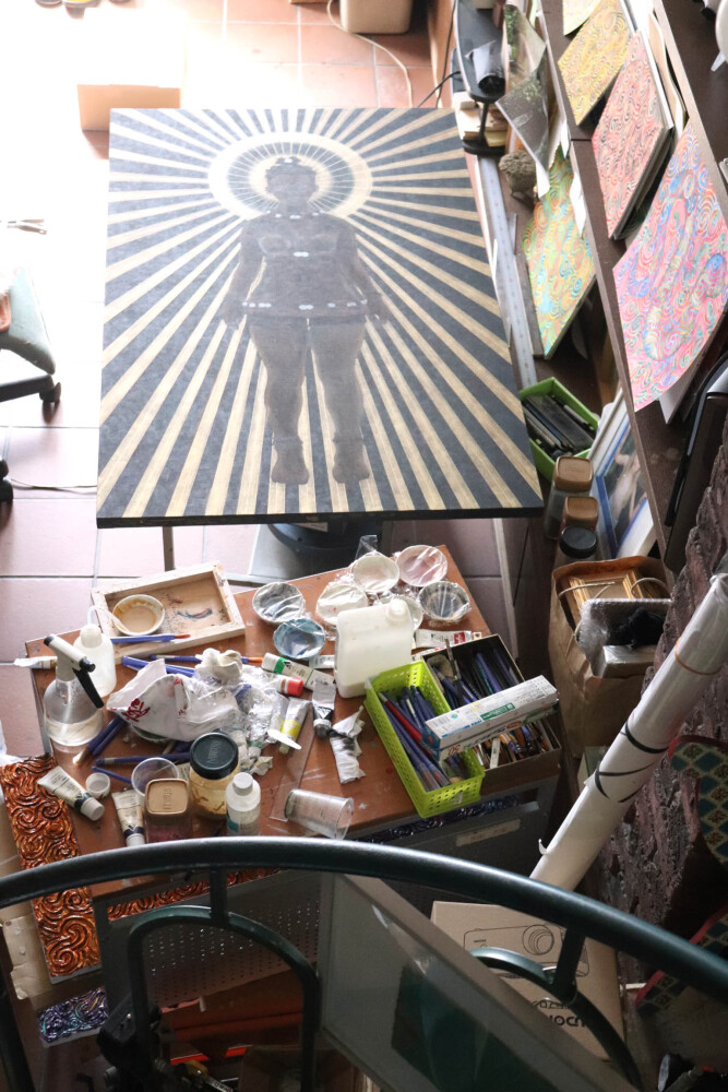 漆と亜麻布著色と水彩と油彩、土偶模造の台を出してかわるがわる制作中