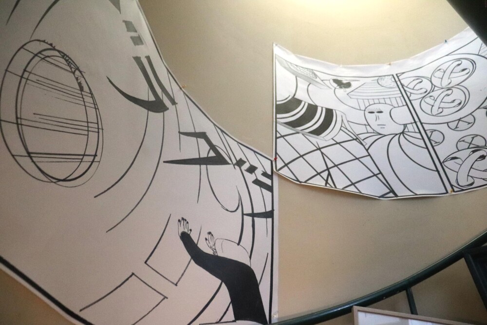 亜麻布著色制作中2025年3月8日(土)~23日(日)午後12時ー7時 月火休みうらじろうギャラリー(東京小伝馬町)https://jiromiuragallery.com/index.html松山賢展「縄文復元模造図絵」とぐろを巻いた蛇に渦巻文様を描いた水彩画、絵具の層に渦巻文を彫り込ん…