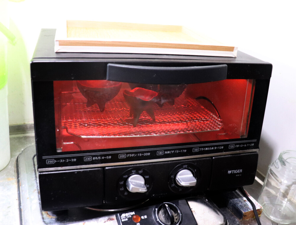 土器に漆を塗り、オーブントースターで焼き付け中。