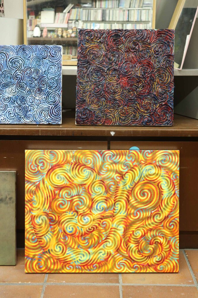 油彩画、水彩画制作中マスキングインクを筆で塗り、背景と図の全体を塗ります。マスキングインクをこすり落としたところに、水彩絵具でグラデーションを入れていきます。3月にみうらじろうギャラリーで個展があります。2025年3月8日(土)~23日(日)…