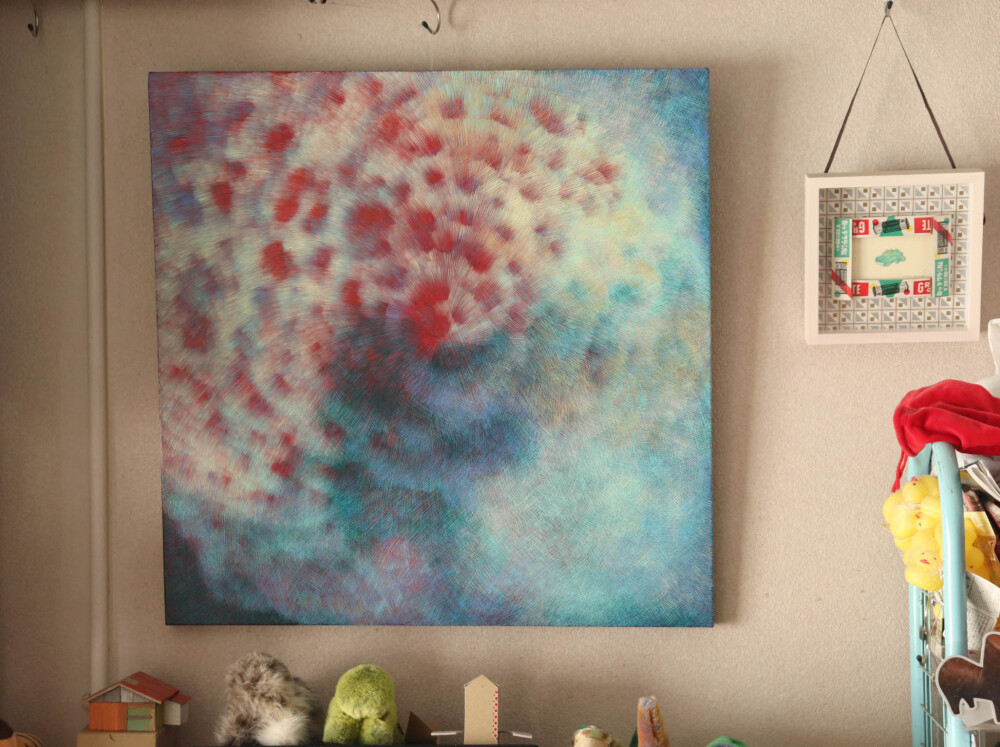 ギャラリー川船入札展示会で落札した作品を部屋に展示しました。https://kawafune.com/2024/11/25/20241202nyusatsu2/右:吉田和夏。左下から石本光男、ARADOMO、西澤徹夫。川田祐子「FLOWER ON THE WATER」2004 hatching acrylic gouache, silver lief on ca…