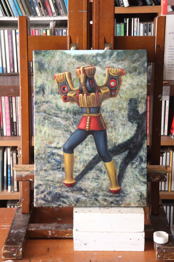 油彩画制作途中です。 来週月曜日から個展です。「土器怪人模型箱絵(イシノツボン)」