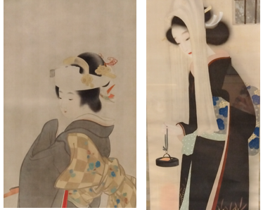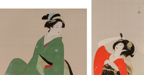 同じような黒色の着物を描いた作品には、大林千萬樹の【美人図】(右)が比較対象になります。同じようにおとなしめな雰囲気を出しつつも、千萬樹の手ぬぐいを咥える仕草は、より直接的な色っぽさを出していますね。