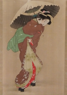 空間(余白)を存分に使った静寂な空間の中で、雨音に耳を傾ける瞬間を切り取っています。やはり、日本画の空間(余白)の使い方は、想像力を掻き立ててくれるようです。雨音を聴く情景から私は、小林麻美さんの「雨音はショパンの調べ」を思い起こしましたが、この絵からは恋の気配は皆無でした。それほど、「無」のイメージでした。女性一人の孤高さと、姿勢の美しさには品格を感じられますし、雨の日でも崩れない日本髪の美しさは、女性の丁寧な性分が見えるようです。まさに、「一点の卑俗なところもなく、清澄な感じのする香り高い珠玉のような絵」といえますね。