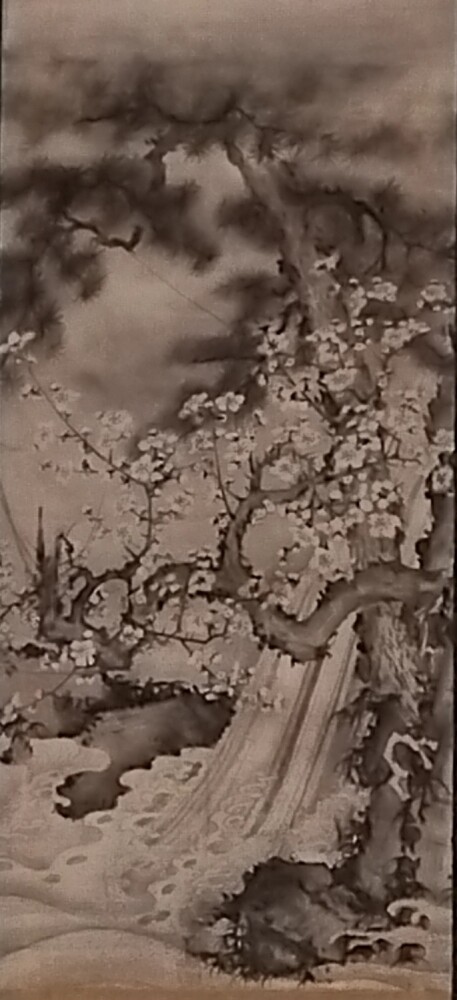 松と梅と滝という、よく取り扱われる題材が描かれたものですが、梅の迫力と水の豪快な流れが私の記憶の中では段違いでした。この迫力は梅の木に使われた1本の線の強さが効いていると感じましたが、松葉の黒と梅花の白が強い遠近感を出していて、より立体的に見ることができました。