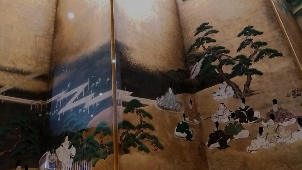 屏風の鑑賞の仕方を勉強しつつあったので、この作品の水の流れに注目することで奥行きの概念が認識できたことは非常に嬉しいことでした。あくまで私の鑑賞の仕方ですが、右隻の八橋は、第3,4扇が前面に第1,2扇が遠景そして第5,6扇がちょっと後ろに見えたので、 第4,5扇の間を斜め左から右にかけて鑑賞すると立体的に感じることができました。次に、左隻の布引は、川が真横に流れている第3~6扇が平面、滝のある第1,2扇が少し奥の方向に見えたので、第3,4扇の間を斜め右から左にかけて鑑賞すると想像通りの立体性が見えました。