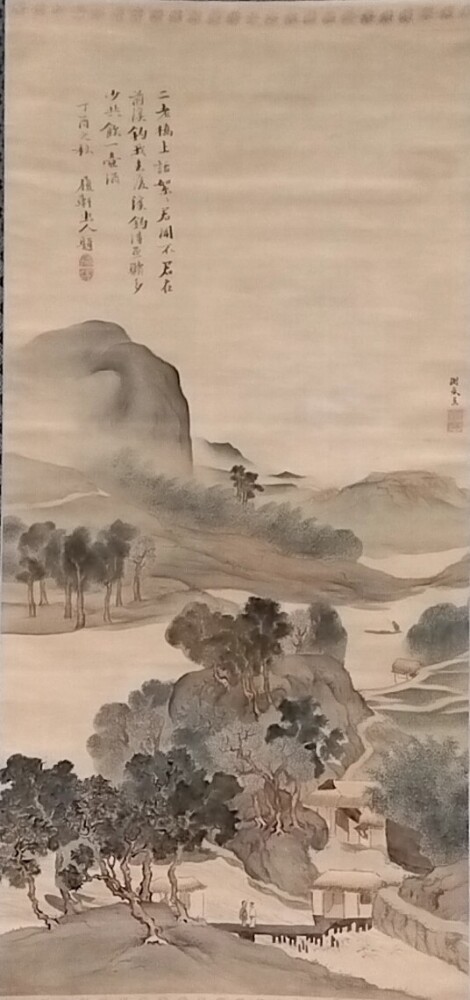 与謝蕪村の作品を又見る機会を得たのはとても 嬉しいことです。落款の字を見るとクセの少ないもので、以前鑑賞した奥の細道画巻のクセ強文字とは異なっていました。さて、奥の細道の字体がわざとなのか、こちらが堅苦しくしたのか?絵は遠景の山、近景の森のため、最も近景の住宅と人がより小さく見えます。また、中井履軒の賛文には「どちらが魚を多く釣れたか賭けようではないか。そして釣り終えたら一緒に一壺の酒を飲み干そう。」とあり、大自然の中に見られる日常がこの絵の主題だと理解しました。ちなみに、小さく小さく描かれた人物を見ると奥の細道画巻、闇夜漁舟図や花見句画賛 と同系統でしたのでやはり蕪村かと安心しました。