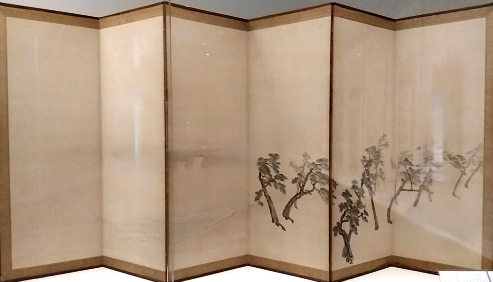 私が見た感じでは、第5、6扇が前面におかれ、第1扇に向けて奥へと続くように感じました。だからか、松並木は左端が最も濃く描かれ、右に行くほど徐々に薄くなっていくのは、水墨画の遠近に対応いているように見えました。