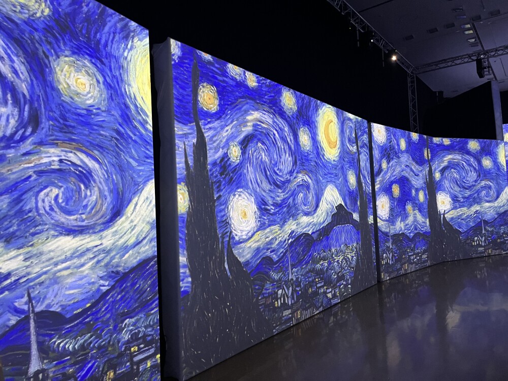 暗い会場内の壁や床に投影された迫力のあるゴッホの絵画…