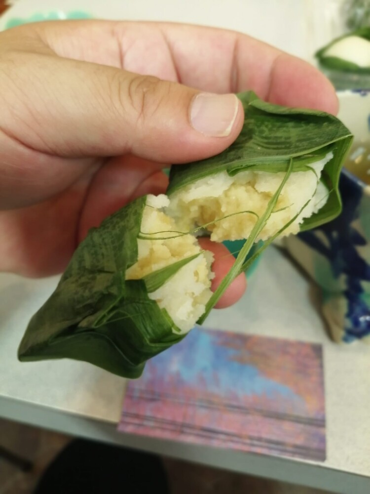 個展を見終わった後は、「みょうがぼち」で一休みしました。みょうがぼちというのは、そら豆と砂糖を練り合わせて作った餡を、みょうがの葉で包んだものです。みょうがの香りとそら豆の甘さが絶妙に合っています。