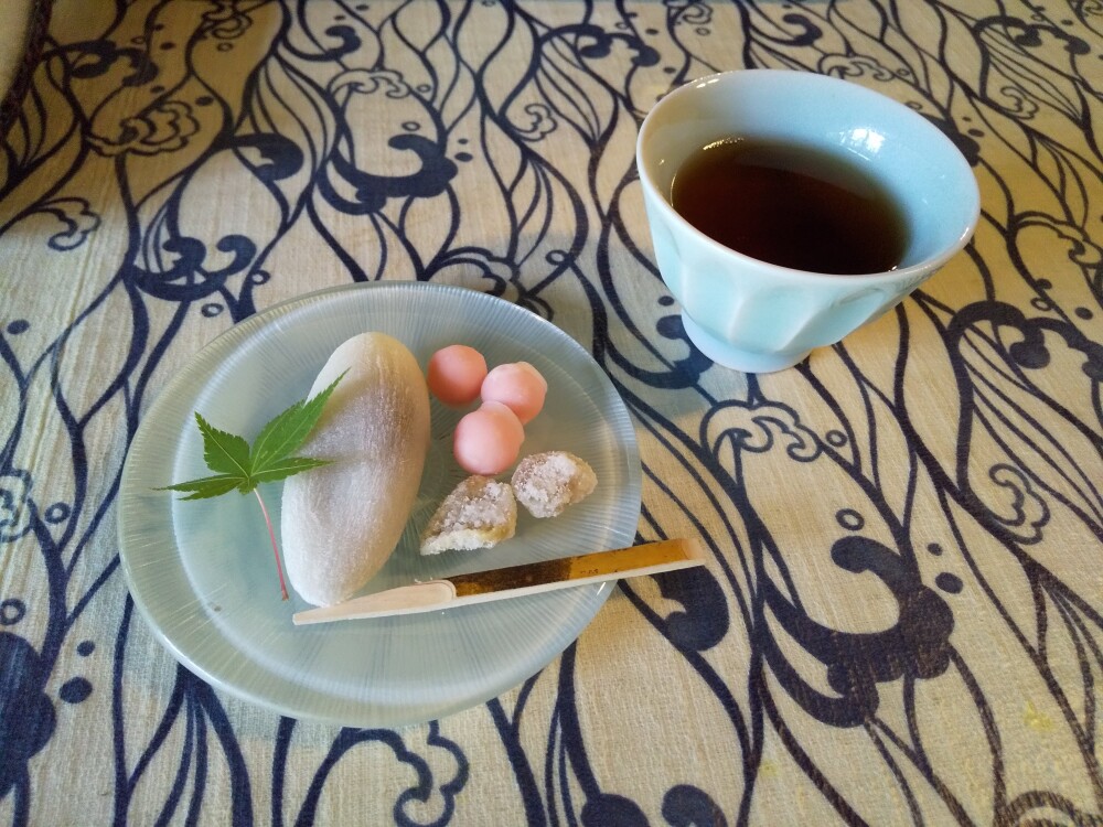 白地に紺の波濤模様のテーブルクロス、ガラス製菓子皿に菓子に添えられた青紅葉も涼し気で・・・旅人が求める【京都】という非日常は正にここだ!と大福をもちもち嚙みしめながら浸ります。