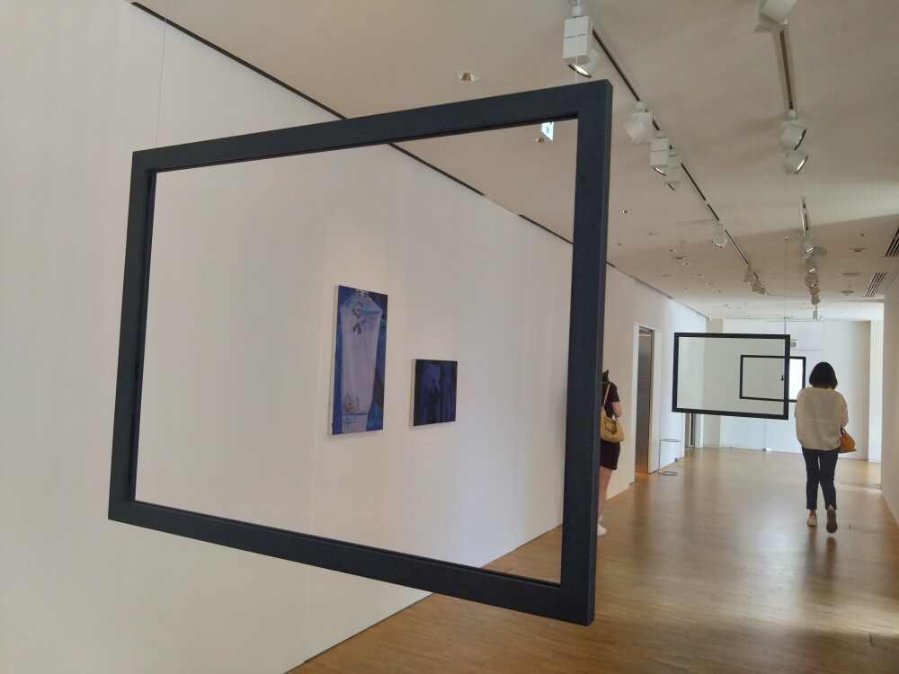 写真展で使われるような、縦横60cmくらいの黒のフォトフレームらしき額縁が吊り下げられており、まるで自分が展示作品になったような錯覚になります。